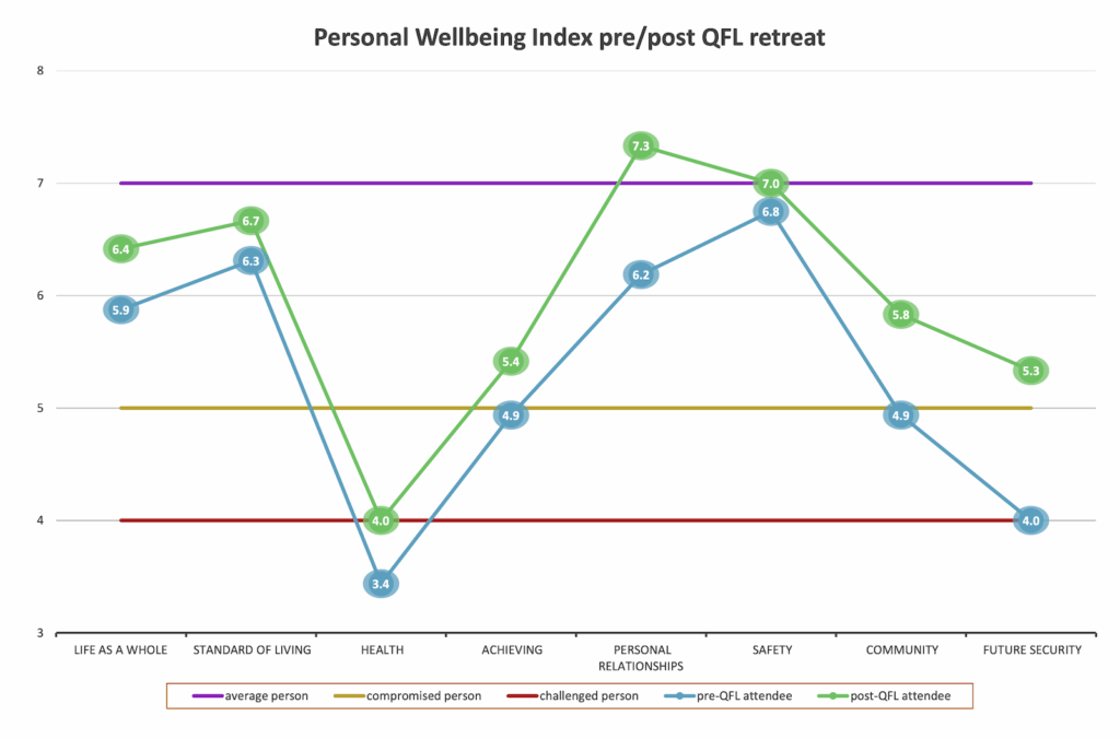 All participants completed a Standardised Wellbeing Index Questionnaire. In comparing the results between pre and post program attendance, there is a mean measurable increase in Wellbeing in all areas from involvement in the program, with the most significant increases being in the areas of personal relationships, community and future security.